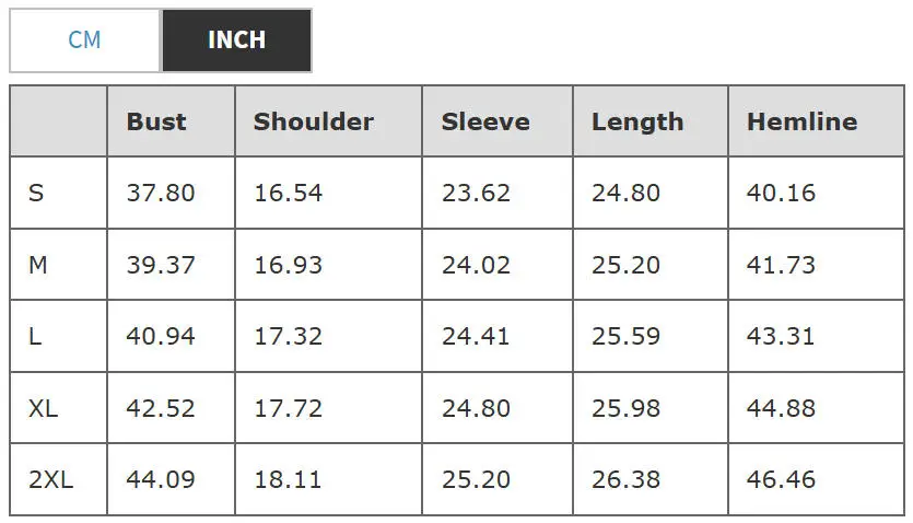 Top Size Table: