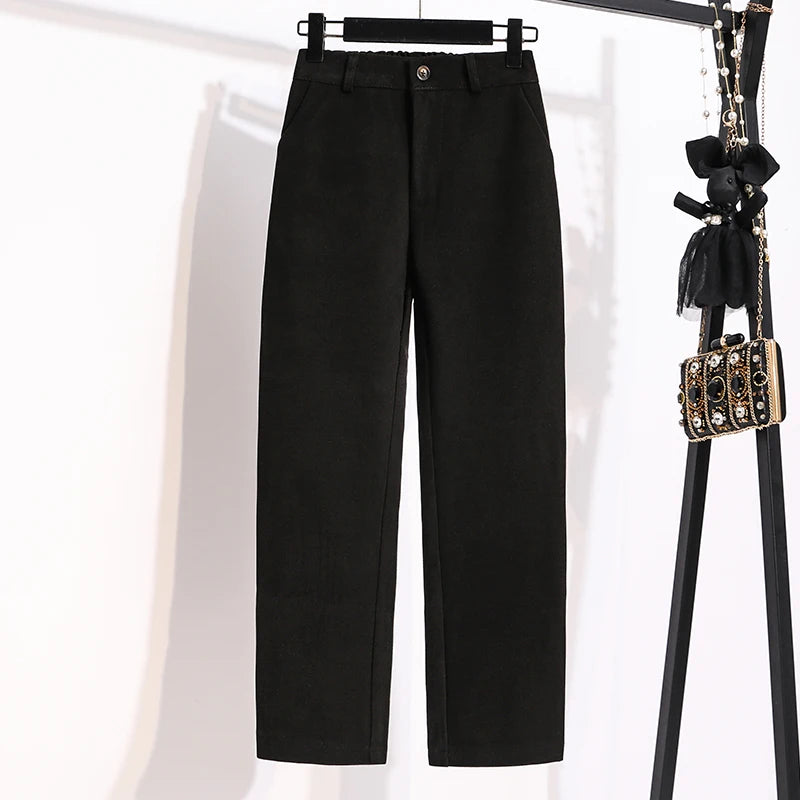 Plus Size Woolen Pants Women 2024 Autumn Winter New Arrivals Beige Or Black Suit Pants Trousers Korean Style Elastic Waist Pants