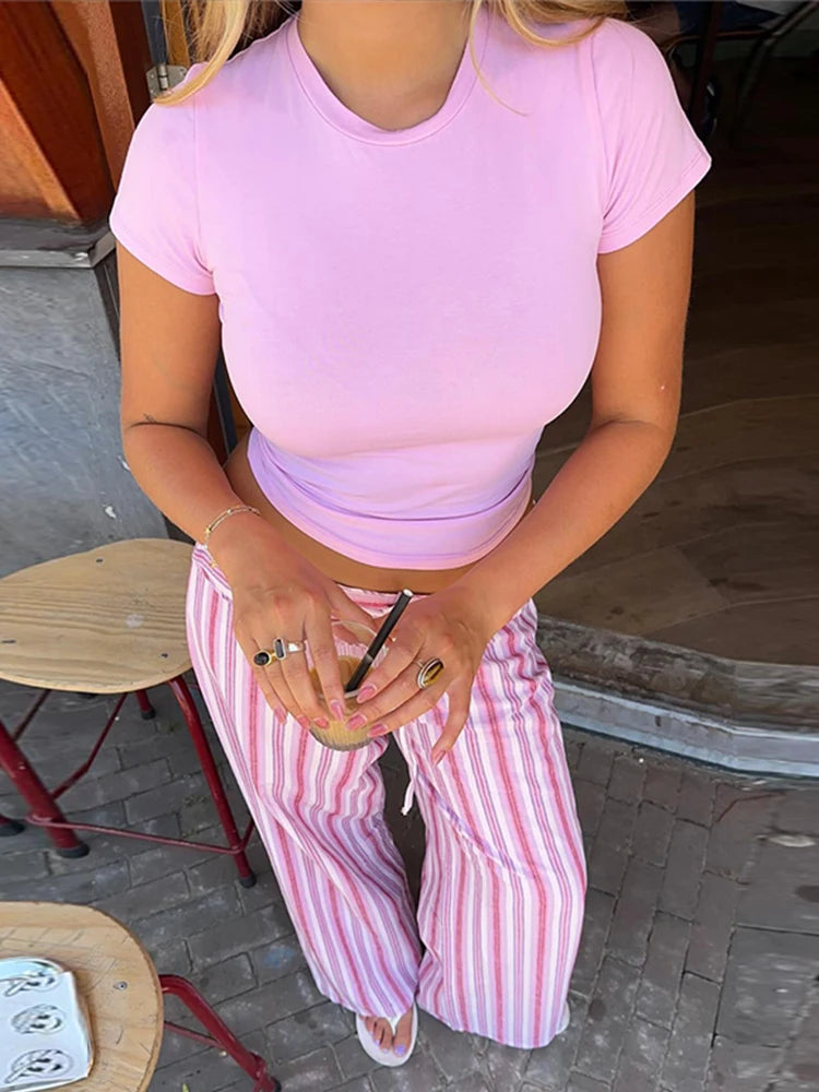 Women Striped Lace Up Vest Pants Set Chic Sleeveless Backless Top High Waisted Trousers Suits 2025 New Lady Streetwear Outfits