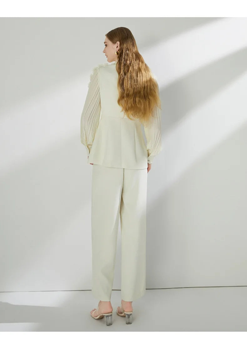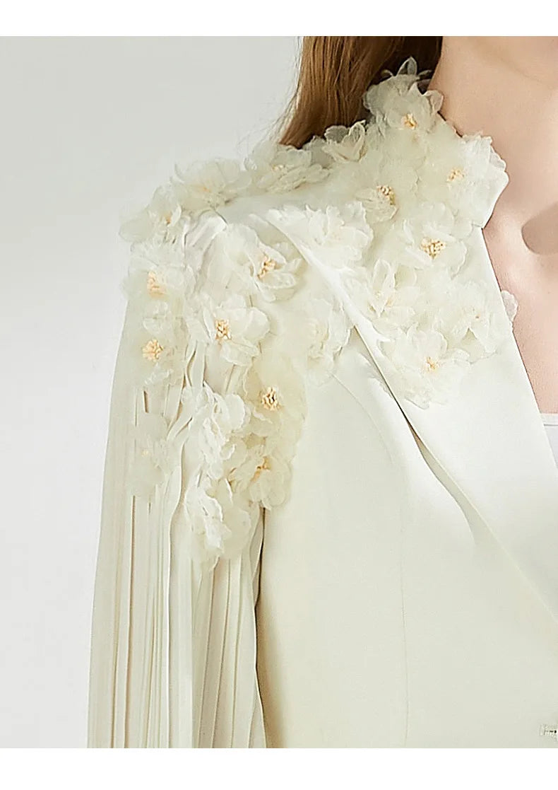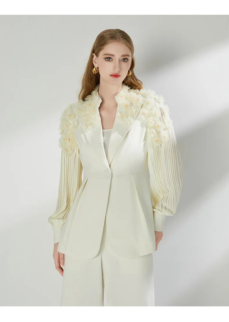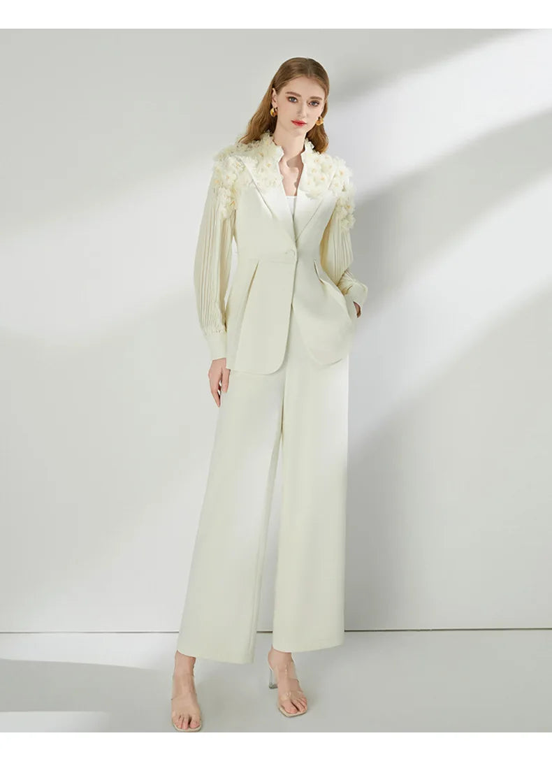 Luxury 2 Piece Sets Women Spring Summer 3D Flower Blazers Coats Wide Leg Pants Suits Crystal Elegant Quality Matching Sets