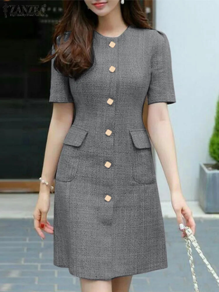 Summer Fashion OL Dress ZANZEA Women O Neck Short Sleeve Sundress Vintage Buttons Up Vestidos Robe Femme Elegant Party Dresses