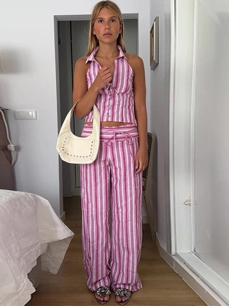 Women Striped Lace Up Vest Pants Set Chic Sleeveless Backless Top High Waisted Trousers Suits 2025 New Lady Streetwear Outfits
