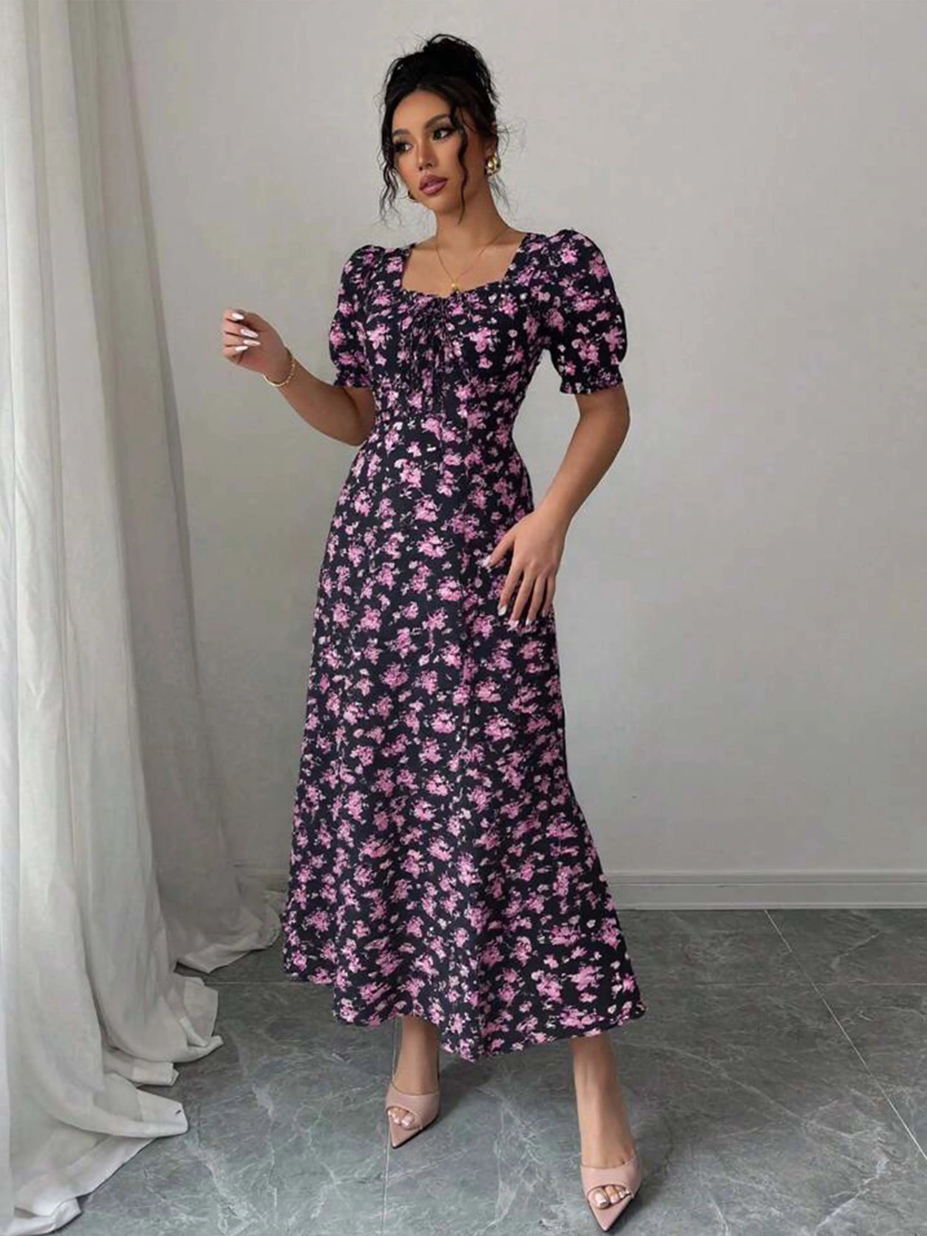 Women's Summer Elegant Casual Puff Sleeve Square Neck Black Floral Print Maxi Dress